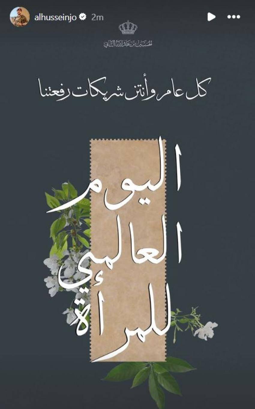 هنأ ولي العهد الأمير الحسين بن عبدالله الثاني، بمناسبة اليوم العالمي للمرأة، والذي يصادف اليوم السبت.