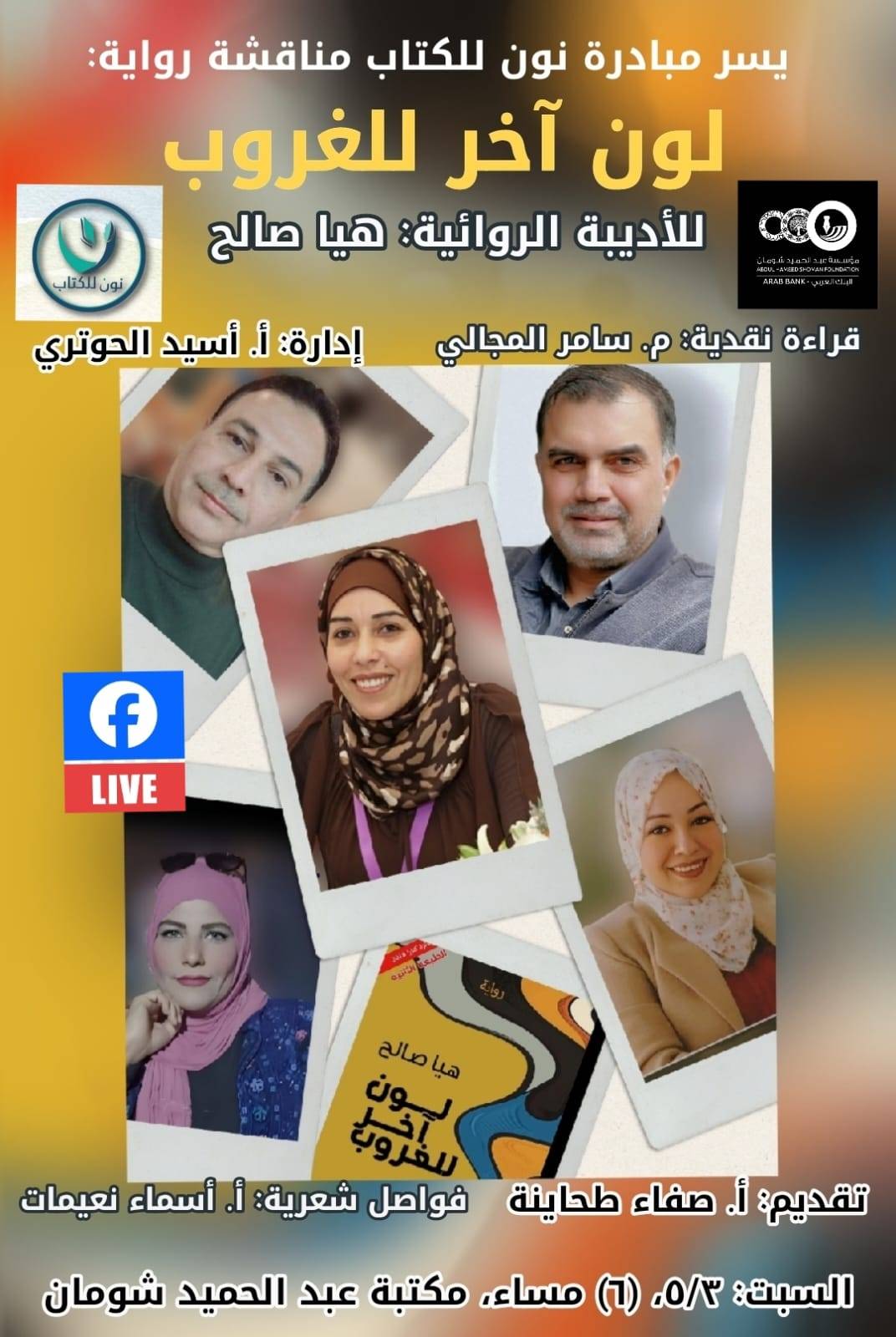 عقدت مبادرة "نون للكتاب" جلستها الثامنة والعشرين لمناقشة رواية "لون آخر للغروب" للروائية هيا صالح، وذلك في مكتبة عبد الحميد شومان بجبل عمّان، مساء يوم السبت الموافق 3/5/2025.