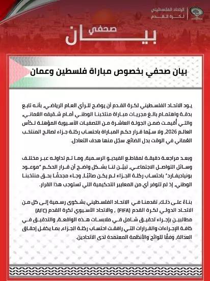 بيان رسمي.. فلسطين تتقدم بشكوى إلى فيفا بسبب ضربة جزاء عُمان