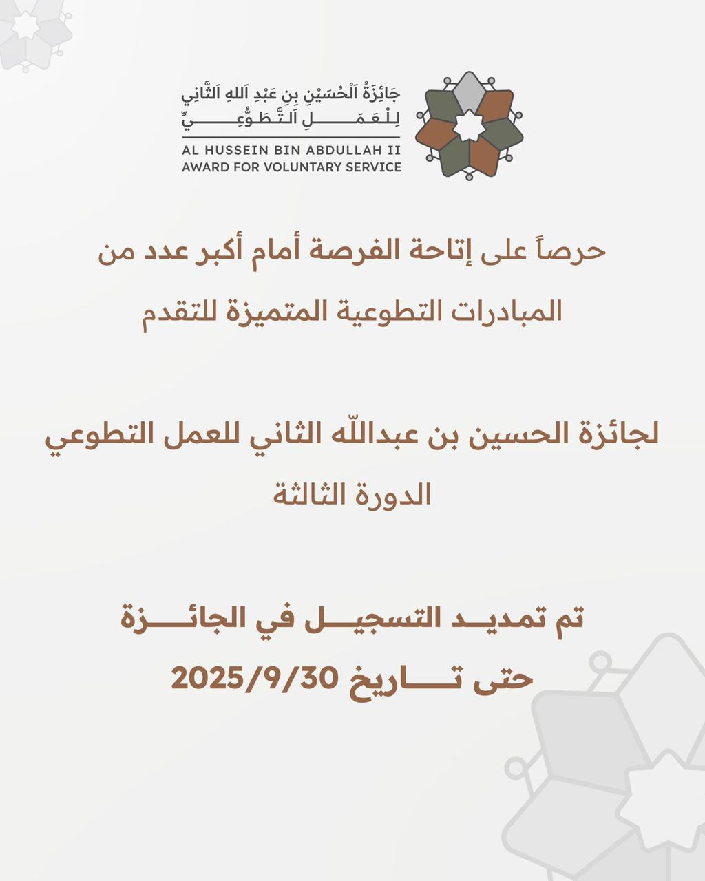 تمديد التسجيل في جائزة الحسين بن عبدالله الثاني للعمل التطوعي حتى نهاية أيلول