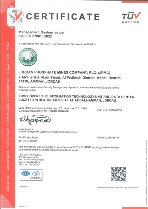 "الفوسفات" تحصل على شهادة "الآيزو" في نظام إدارة أمن المعلومات
