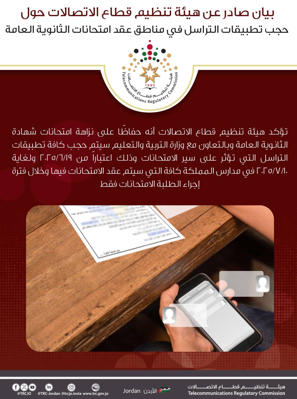 حجب تطبيقات التراسل في مناطق قاعات امتحانات التوجيهي