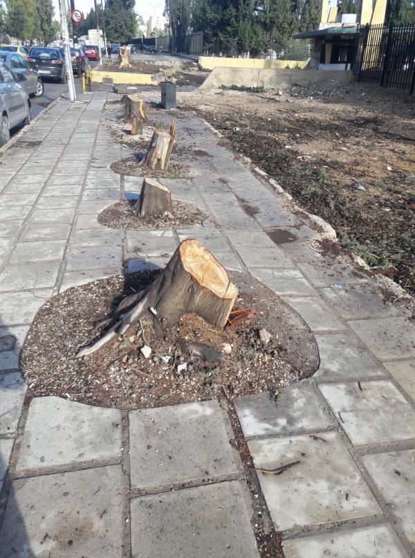 الباص السريع يتسبب بقطع اشجار معمرة في محيط الجامعة الاردنية (صور)