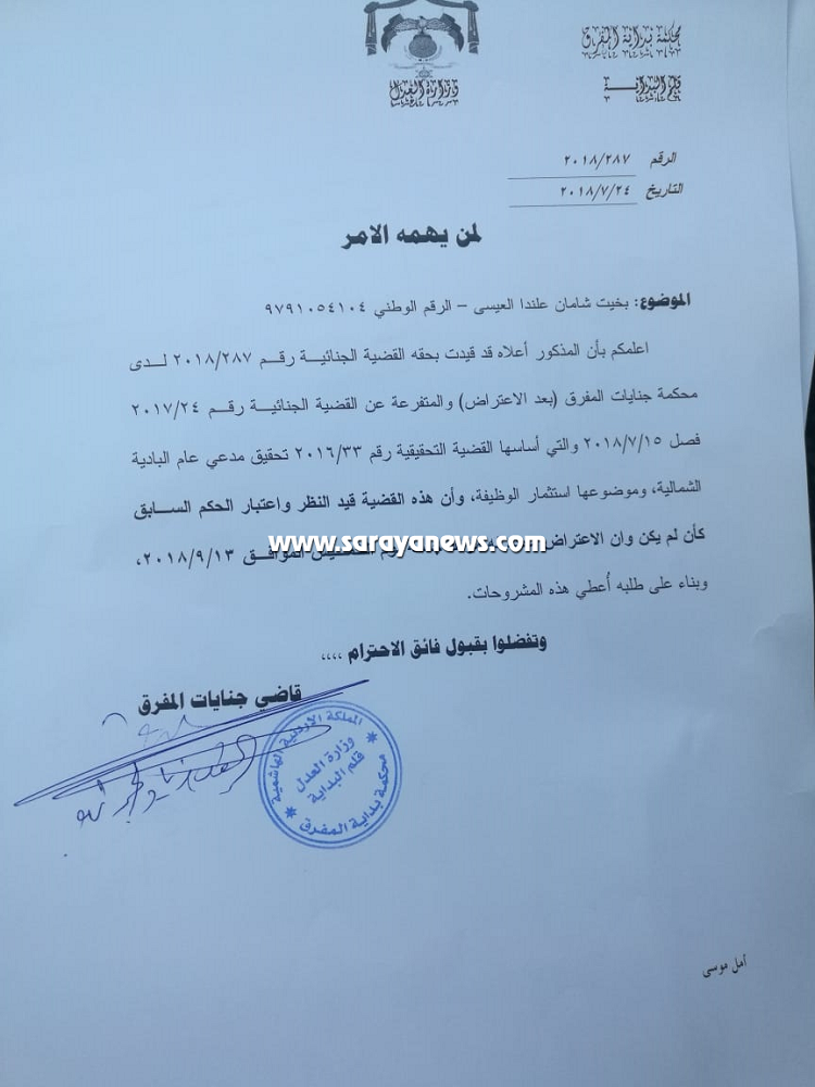 محكمة بداية المفرق تلغي قرار حبس رئيس بلدية صبحا والدفيانه - وثيقة