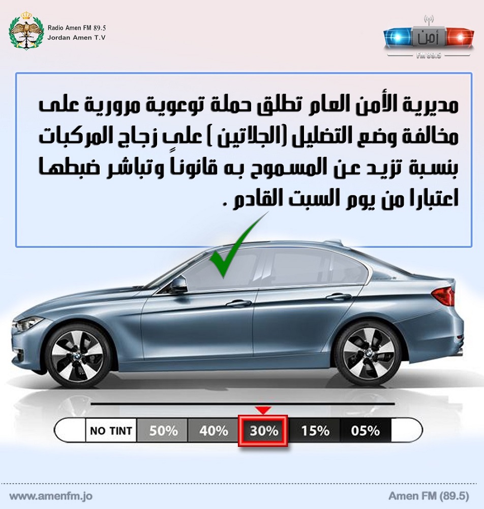 مديرية الأمن العام تطلق حملة توعوية مرورية على مخالفة وضع التظليل (الجلاتين ) على زجاج المركبات بنسبة تزيد عن المسموح به قانوناً وتباشر ضبطها اعتبارا من يوم السبت القادم .