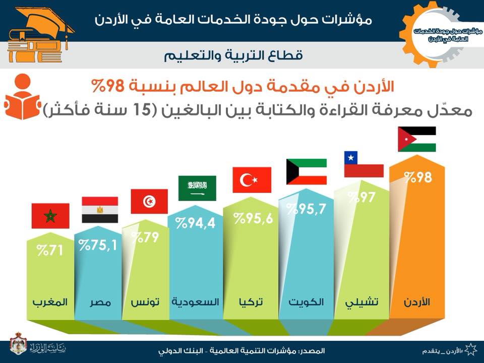 البنك الدولي| يصنف الأردن في مقدمة دول العالم من حيث معدّل معرفة القراءة والكتابة بين البالغين (15 سنة فأكثر).