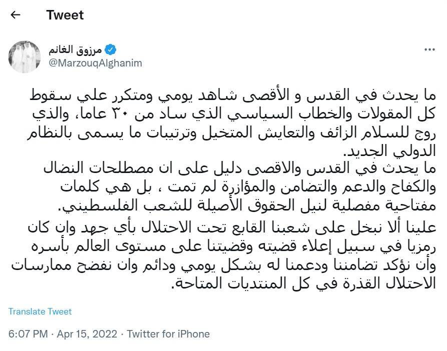 #مرزوق_الغانم معلقا على ما يحدث في #الأقصى: دليل على سقوط خطاب السلام الزائف والتعايش المتخيل #المسجد_الاقصي