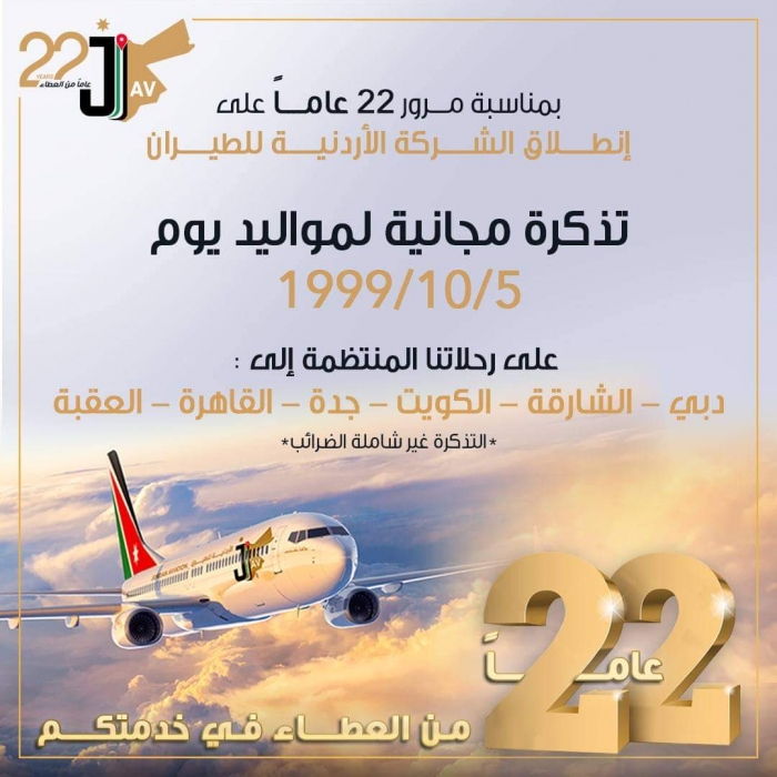 الاردنية للطيران تحتفل بمرور 22 عاماً على تأسيسها وتقدم تذاكر مجانيه
