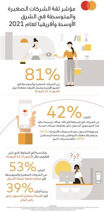 وفقًا لمؤشر ثقة الشركات الصغيرة والمتوسطة في الشرق الأوسط وإفريقيا من ماستركارد: 81% من الشركات الصغيرة والمتوسطة في المنطقة تتطلع بنظرة إيجابية إلى النمو المستقبلي مدفوعة بقدرات التقنيات الرقمية وإمكانية الحصول على التمويل وبرامج رفع مهارات الموظفين
