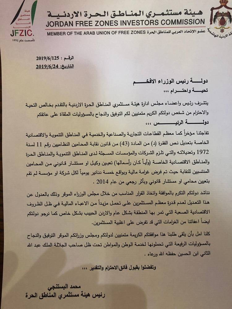 "مستثمري المناطق الحرة" يطالبون الرزاز بإلغاء الزام الشركات بتعيين مستشار قانونيّ
